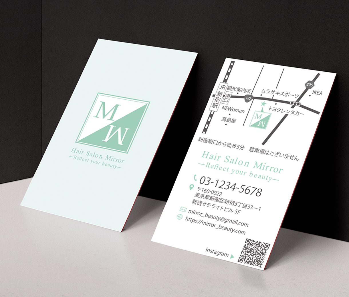 美容室のショップカードデザインです。 ロゴで使用したグリーンをメインに使用し、一体感のあるデザインを意識しました。 パッと見た時に必要な情報が目に入るように、シンプルで綺麗な印象に仕上げ、手に取ってもらいやすいデザインを考えました。店舗ロゴ・連絡先・地図・QRコードを整理して配置し、初めて来店される方にも分かりやすい構成にしました。落ち着きと清潔感を大切にした、長く使えるショップカードです。