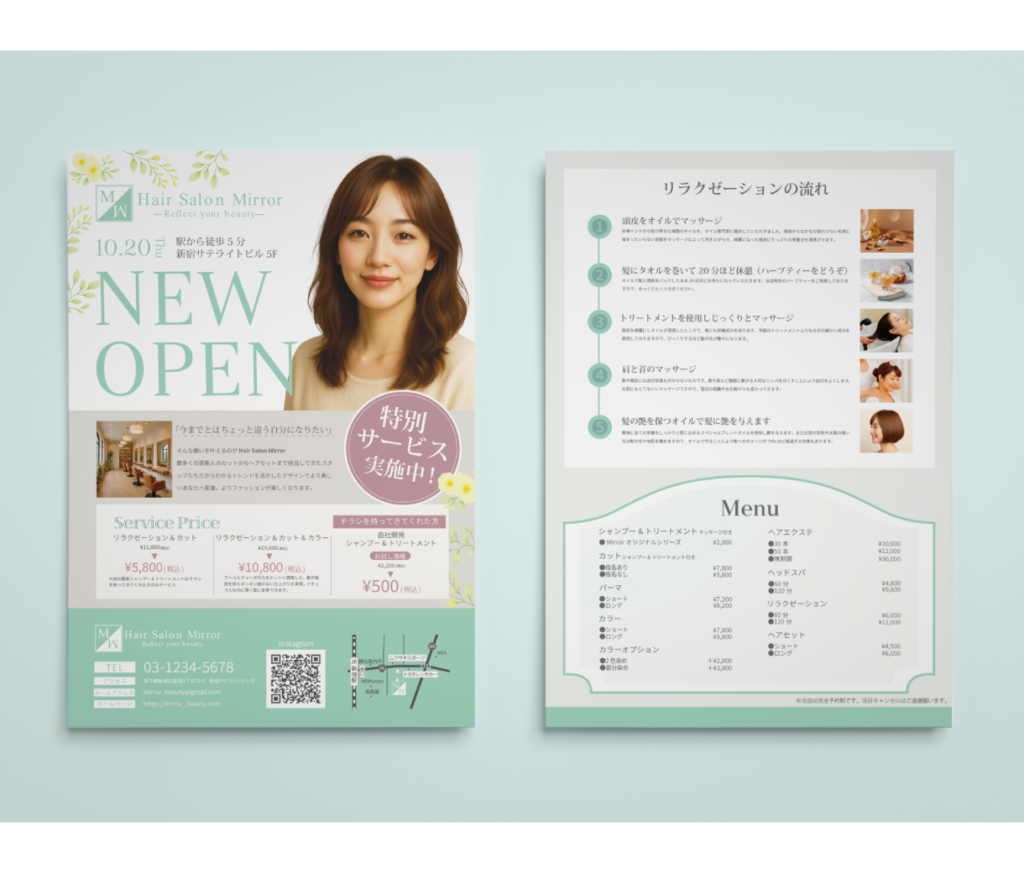 Hair Salon Mirror様|開業広告|集客チラシ 投稿日: 2026年1月26日2026年3月19日 投稿者: kiki 新規オープンする Hair Salon Mirror様の集客を目的としたデザインです。 オープン告知・特別サービス・料金・アクセス情報など、来店判断に必要な情報を整理し、初めて見る方にも分かりやすい構成にしました。ロゴカラーをメインに優しく清潔感のある配色で、安心感と上品さを演出しました。表面は訴求ポイントを強調し、裏面は施術の流れやメニューを丁寧に伝えることで、来店につながる導線を考えました。